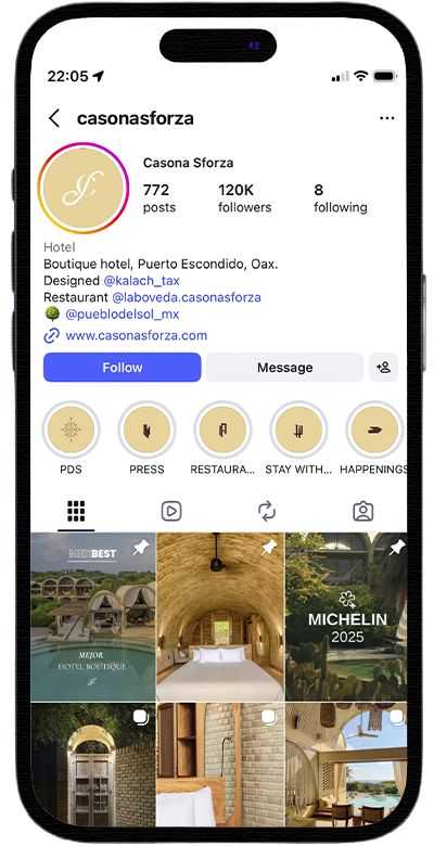 Casona Sforza’s social media presence was built with precision—every visual, tone, and caption aligned to a clear aesthetic and voice. The Instagram profile became a curated extension of the brand: warm, refined, and immersive. We established a recognizable visual system that reflects the essence of Casona Sforza and connects authentically with its audience.